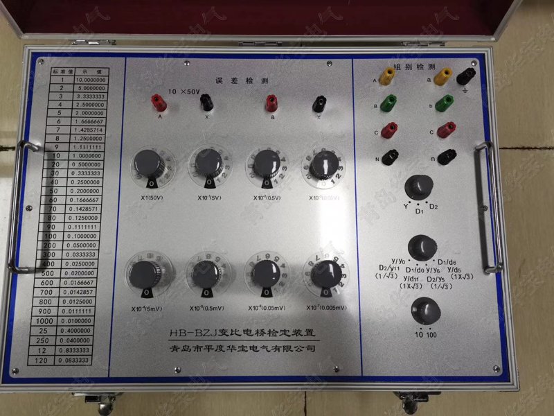 HB-BZJ3三相变比电桥检定装置是青岛市平度华宝电气有限公司研制生产的主要用来检定各种变压比电桥,既可单相三相检定其误差又可检定其连接组别。该设备准确度高,设计变比测试范围广,适用于检定各种变压比电桥。HB-BZJ3型一次接线即可完成三相变压器变比组别测试仪的校验检定,大大提高了工作效率及校验精度,是计量院、电科院、检测公司理想的校验工具。另外该设备还可以用来作为高精度感应分压器来使用。在检定变压比电桥误差时,单相检定不能完全反映各开关内部连线是否正确,IEC74-4文件要求(变压比电桥检定规程也将规定),电桥在检定误差后,还必须用各种连接方式的实际三相变压器进行检定。因此,装置中设计有三相组合电压互感器,该仪器由三台精密电压互感器组成,通过开关切换成各种接线方式的实际三相变压器,并有多个变比。该设备准确度高,体积小,重量轻,使用方便。