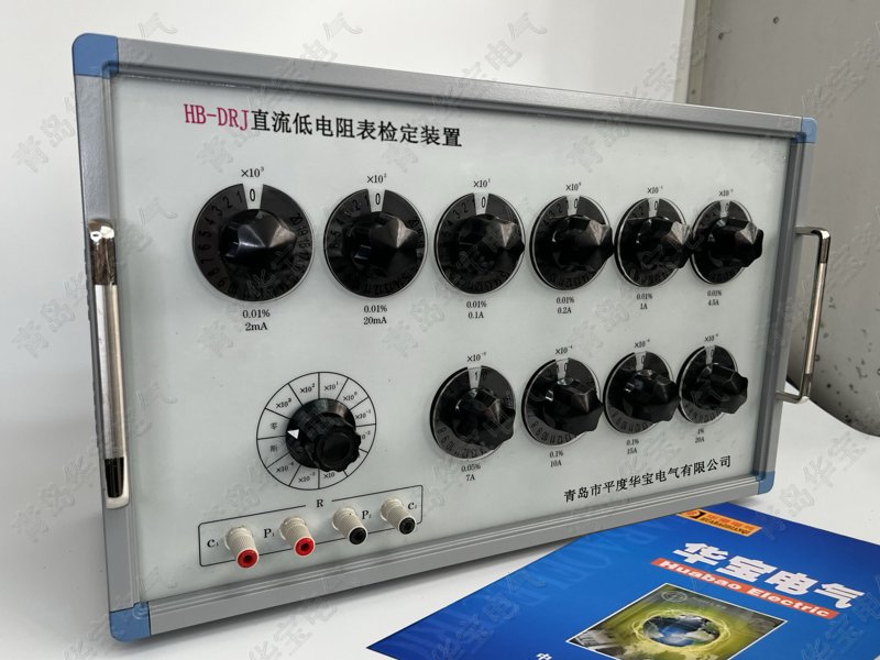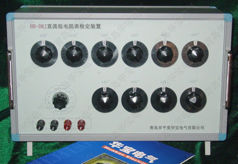 HB-DRJ型直流低值电阻表校验仪是青岛华至宝电气有限公司(青岛市平度华宝电气有限公司)依据国家相关标准研制生产的计量、校准、检定直流低电阻测试仪(数字电桥、微欧计等)标准器。本仪器共有十个量程×10E3Ω、×10E2Ω、×10E1Ω、×10E0Ω、×10E-1Ω、×10E-2Ω、×10E-3Ω、×10E-4Ω、×10E-5Ω、×10E-6Ω。每个量程有20个电阻值。×10E-2Ω、×10E-3Ω、×10E-4Ω、×10E-5Ω、×10E-6Ω量程是一台专用直流模拟电阻箱,采用电阻网络线路,在直流电压等效这一原理下,提供(0.01mΩ~1μΩ)直流模拟等效电阻。